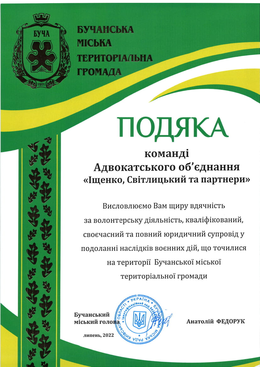 Команда адвокатів, юристів, та інших спеціалістів одна із перших організувала фіксацію збитків та руйнувань та надавала консультації в містах Київської області – Буча, Ворзель, Макарів, Бородянка.